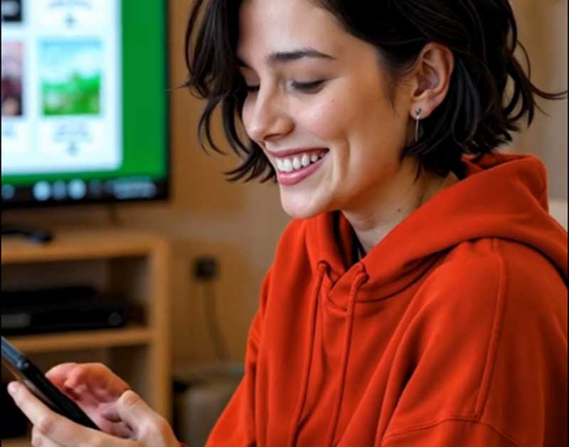 Персонаж, женщина в красной толстовке, говорит по-немецки и рекламирует услуги высокоскоростного домашнего интернета.